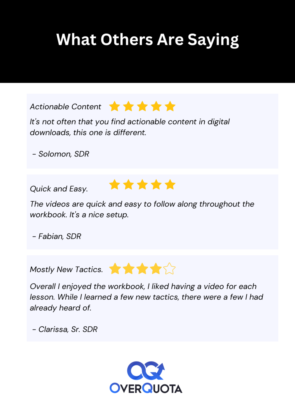 This interactive workbook provides step-by-step guidance to build an effective cold call script. The workbook comes with video lessons, a complete formula, and tangible examples you can use. After reviewing the lessons and materials, you will have your own cold call script to find success on the phones.